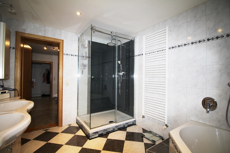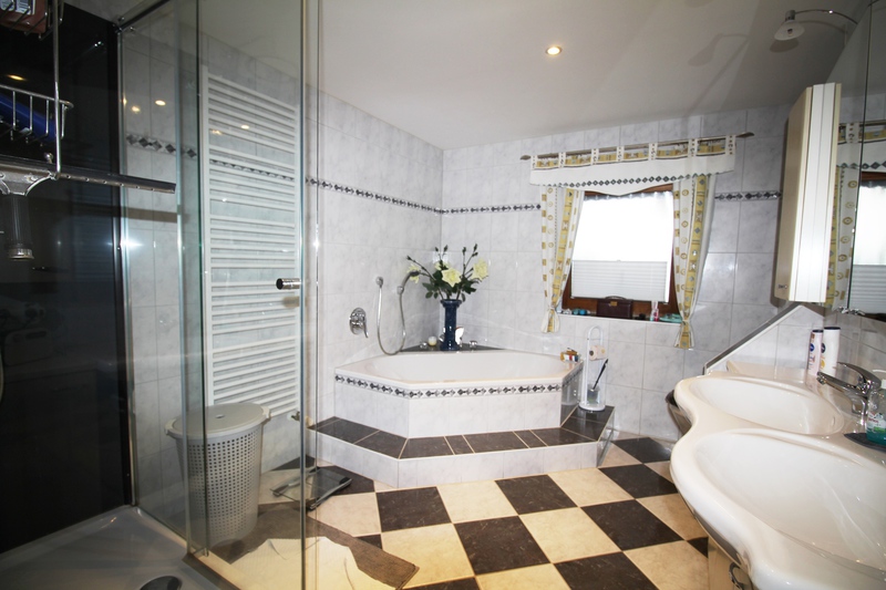Im Erdgeschoss befinden sich das großzügige und gepflegte Bad mit Badewanne, Dusche, WC und zwei Waschbecken, der große helle Wohnbereich, ein Esszimmer mit Erker, eine Küche mit einer schönen, weißen Einbauküche, eine zusätzliche- geräumige Diele, ein Hauswirtschaftsraum und ein Gäste WC.