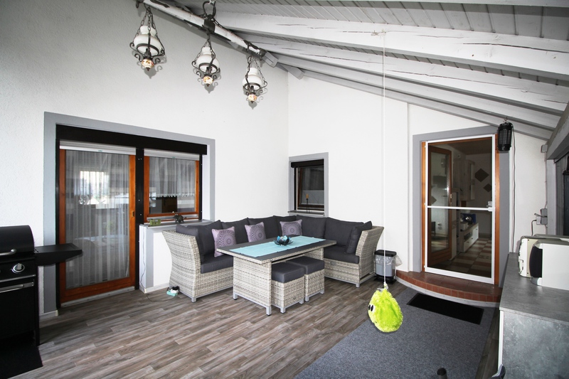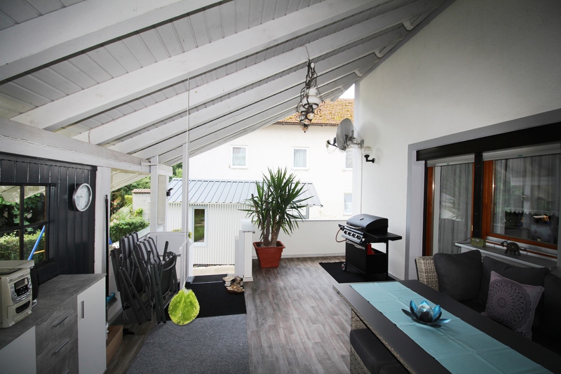 Vom Wohnzimmer und von der Diele aus gelangt man auf die überdachte Terrasse mit Sichtdachstuhl – Ein Highlight des Hauses.